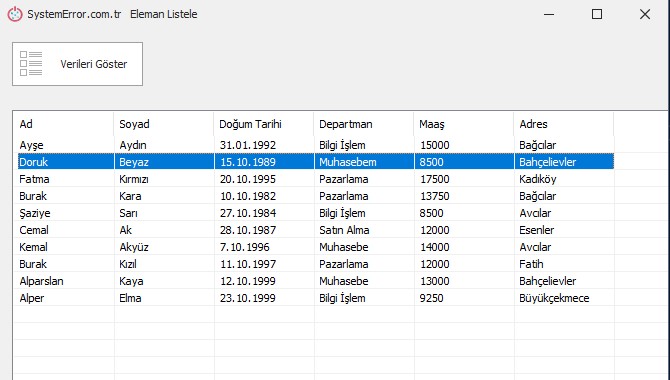 personelListesi.Add(new Personel("Alper", "Elma", new DateTime(1999, 10, 23), "Bilgi İşlem", 9250, "Büyükçekmece"));